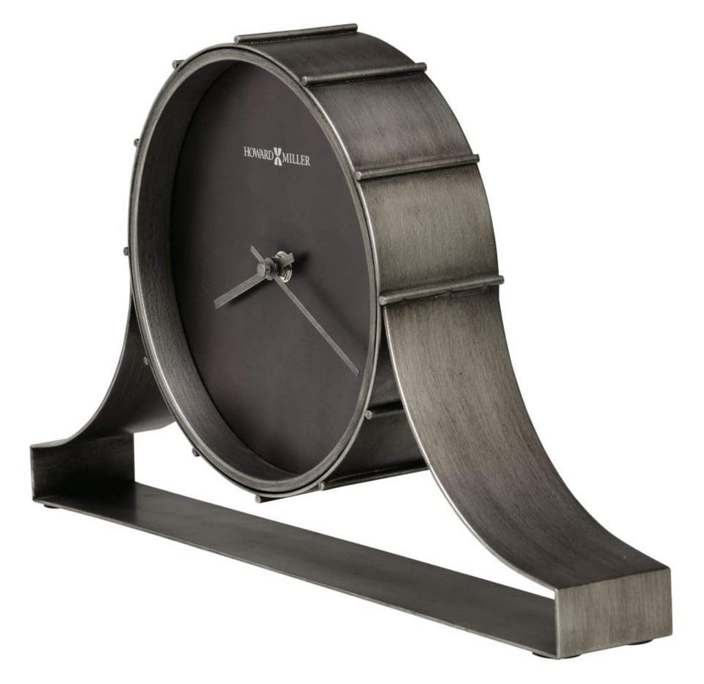 - This striking, industrial metal mantel clock features a bent iron tambour frame with an aged silver finish.