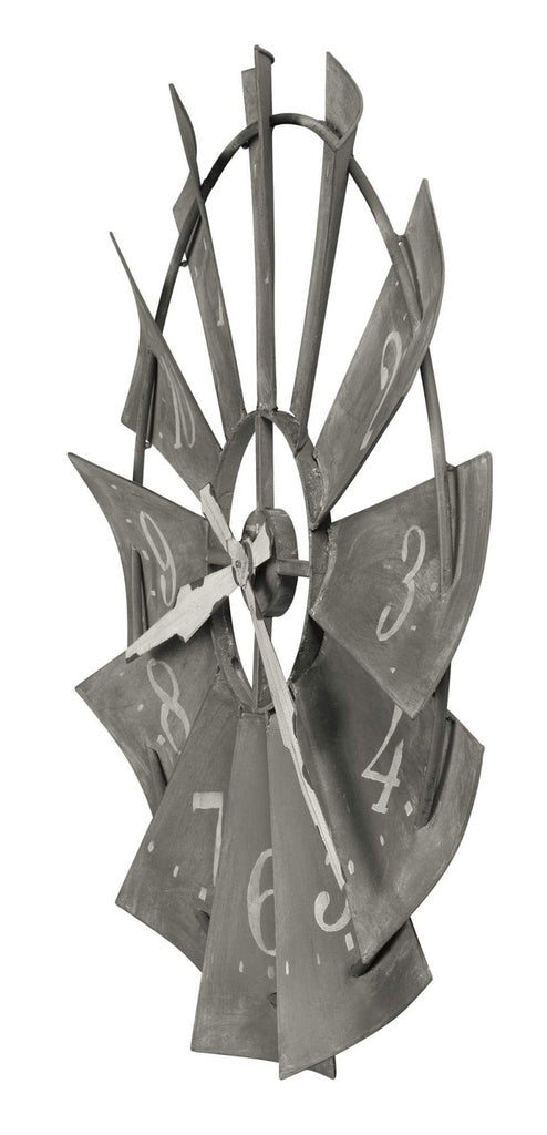 - Aged white Arabic numerals and minute track decorate the fixed windmill blades.